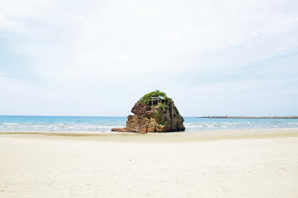 海岸に着くと目の前に現れるのが、この「弁天島」!広い海岸になぜかここにだけ小さな島があります!